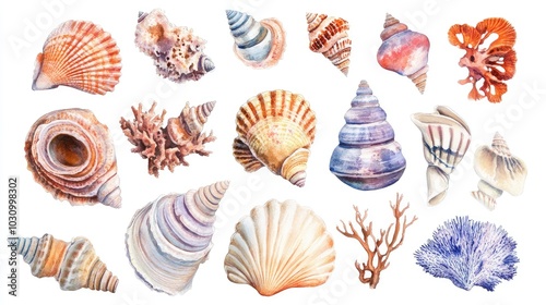 A collection of intricate seashells and corals on a white isolated background.