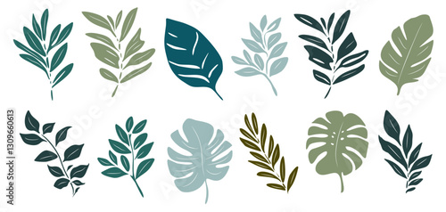 A collection of leafy plants in various shades of green. The leaves are drawn in a stylized way, with some appearing to be more delicate than others. Scene is one of tranquility and natural beauty