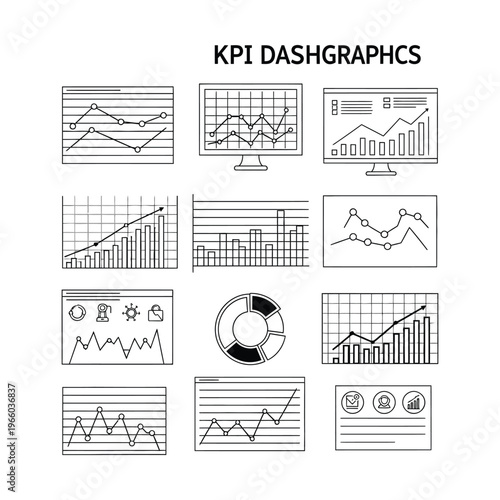 A collection of line graphs, bar charts, and pie charts representing data visualization and business analytics dashboards.