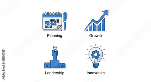 A collection of modern line icons representing core business concepts such as strategic planning, financial growth, effective leadership, and creative innovation
