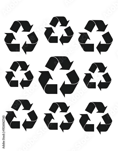 A collection of nine black recycling symbols on white background