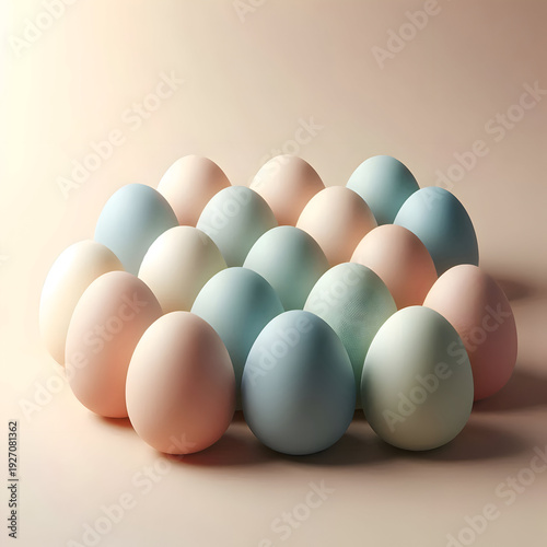 A collection of pastel-colored Easter eggs arranged in a clean, simple line, soft lighting, neutral beige background, minimal design
