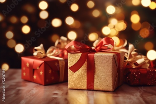 A collection of presents arranged neatly on a sturdy wooden table. Perfect for holiday and birthday celebrations