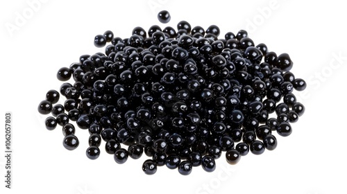 A collection of round, dark-colored, possibly glass, beads on a plain white background. These small, shiny spheres could be used for various purposes including jewelry and craft projects.