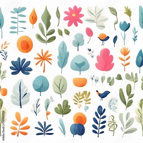 A collection of seamless pattern, colorful abstract plants and flowers. Hand drawn Collection of leaves and flowers. A close up of a pattern of flowers and leaves.