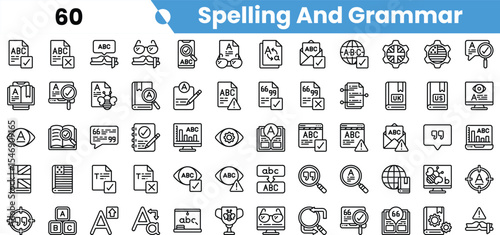 A collection of spelling and grammar-themed icons in a minimalist black and white design, showcasing educational tools and symbols.
