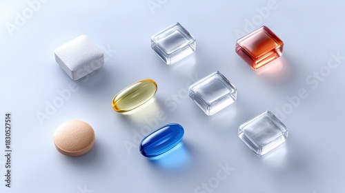 A collection of various pills and transparent cubes arranged on a light-colored surface, captured in a studio setting.