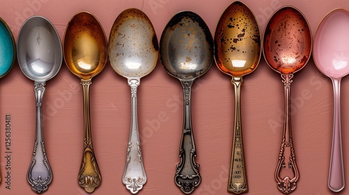 A collection of vintage spoons with intricate designs and varying colors arranged neatly on a soft pink background