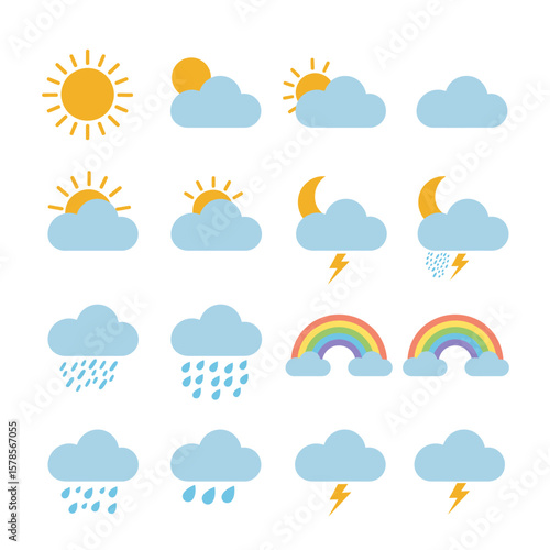 A collection of weather icons showcases various conditions like sunshine, clouds, rain, and rainbows, presented in a clean and modern vector style suitable for design projects.