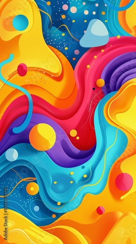 A colorful abstract painting with a lot of swirls and dots. The colors are bright and vibrant, creating a sense of energy and movement