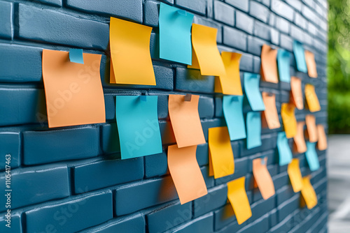 A colorful arrangement of sticky notes on a textured blue wall, showcasing creativity and organization in a workspace setting.