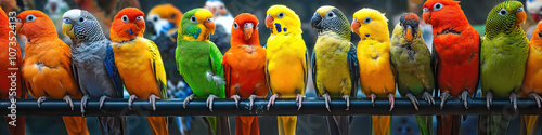 A colorful array of exotic birds at a pet store.