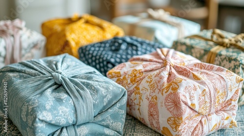 A colorful assortment of beautifully wrapped gifts with elegant fabric and bows, creating a charming and festive display.