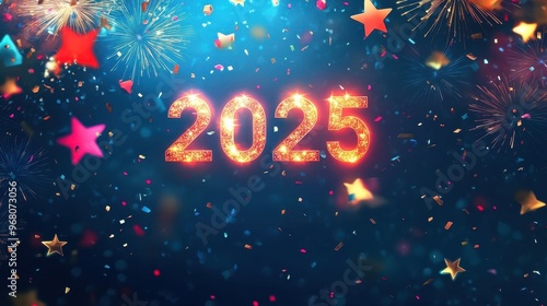 A colorful banner highlights the year 2025 with sparkling graphics and festive decorations, perfect for New Year celebrations