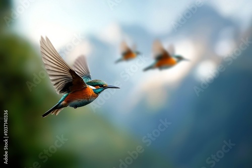 A colorful bird flies gracefully against a blurred natural background, showcasing its vivid plumage and the beauty of nature.