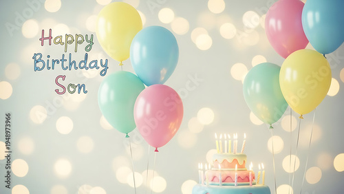 A colorful birthday celebration with balloons and cake for a special son