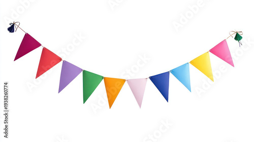 A colorful bunting decoration with triangular flags on a string