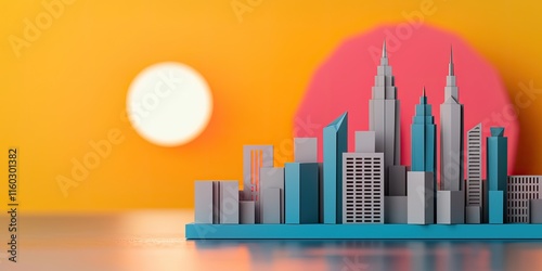 A colorful city skyline with modern buildings set against a vibrant sunset background creates a captivating urban scene.