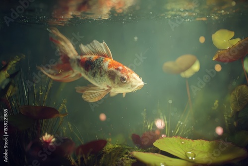 A colorful fish gracefully swims in an aquatic scene with lily pads and aquatic plants. Gentle lighting creates a serene underwater mood.
