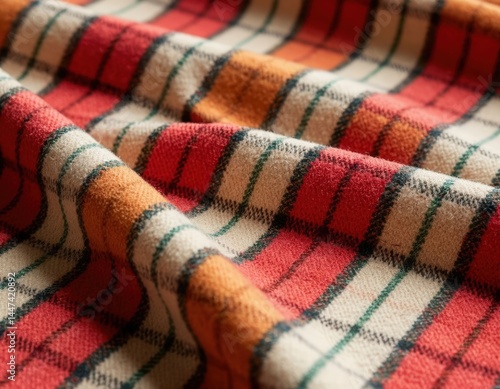 A colorful flannel fabric in macro, showing plaid pattern and fuzzy fibers.