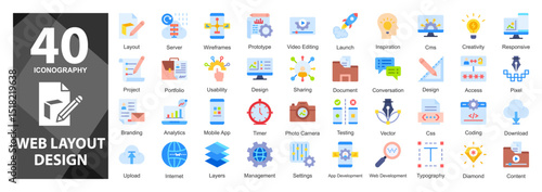 A colorful flat icon set focused on creative content blocks, layout modules, and core interface elements for modern web and mobile apps.