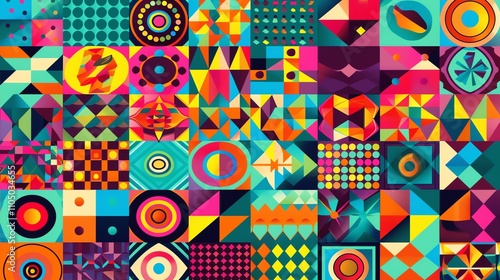 A colorful, geometric pattern made up of squares, circles, and triangles.