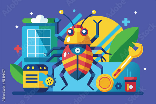 A colorful illustration depicting bug fixing concepts with a large bug, tools, and graphical elements in a vibrant workspace