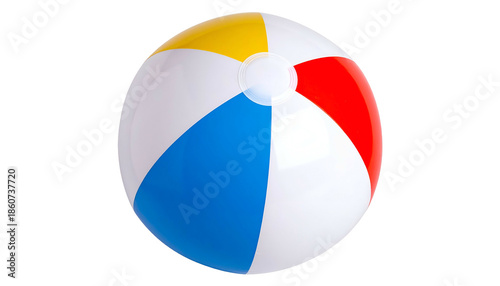 A colorful inflatable ball with red, yellow, blue, and white segments, floating on black