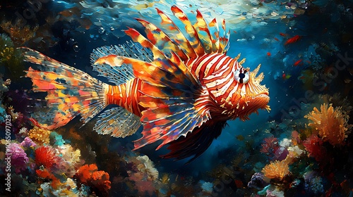 A colorful lionfish swims through a vibrant coral reef.