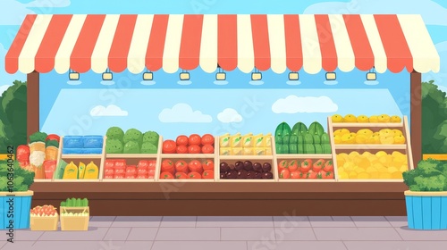 A colorful market stall displaying various fresh fruits and vegetables for sale.