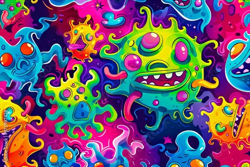 A colorful pattern of monsters and aliens.