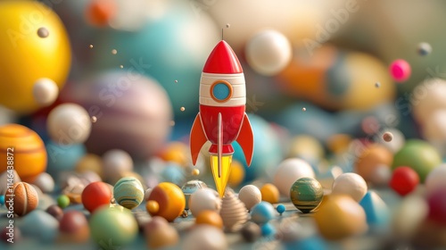 A colorful rocket stands amidst various spheres, evoking a whimsical, space-themed scene filled with playful, vibrant elements.
