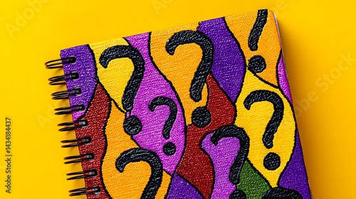 A colorful spiral bound notebook with a cover design featuring black question marks and exclamation points
