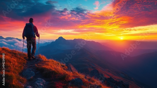 A colorful sunrise view from a mountain trail, with a hiker silhouetted against the vibrant sky, offering a dramatic and inspiring scene with space for copy.