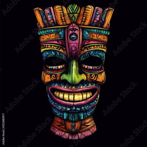 a colorful tiki mask on a black background