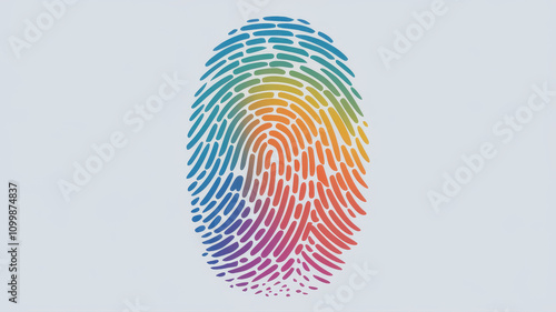 A colorful, vibrant fingerprint design, symbolizing identity and uniqueness with a gradient of rainbow colors against a soft blue background.