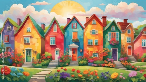 A colorful, whimsical illustration of a row of houses in various shapes and sizes