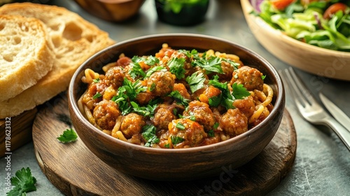 A comforting bowl of spaghetti and meatballs garnished with a sprinkle of fresh parsley, served with crusty garlic bread and a side salad, perfect for a hearty family meal.