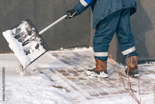 A Communal services worker clears snow from a path near a building in winter.