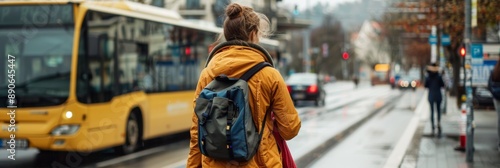 A commuter on public transit, exuding calmness and efficiency, adeptly manages her work commute