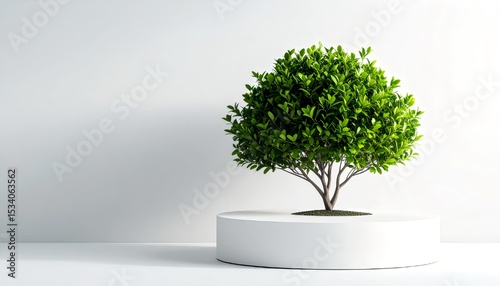 A compact Japanese boxwood shrub, perfectly trimmed and positioned on a flat white platform, photorealistic look, minimal style with soft ambient light