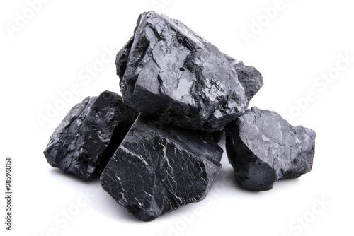 A compact pile of dark rocks sits atop a clean white surface, perfect for use in still life or design compositions