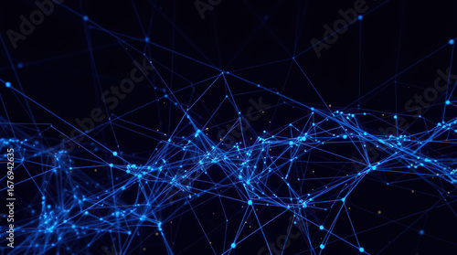A complex abstract composition of intertwined blue lines and dots on a dark blue background.