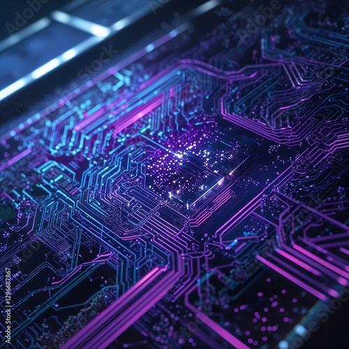 A complex circuit board glows with bright purple and blue lines, forming intricate patterns that suggest advanced technology in a futuristic setting, evoking a sense of sci-fi innovation