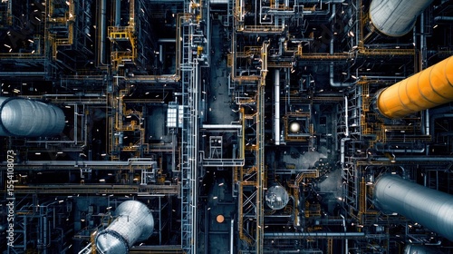A complex industrial plant with numerous pipes, tanks, and machinery. The scene is dark and industrial, with a focus on the intricate network of pipes and equipment.