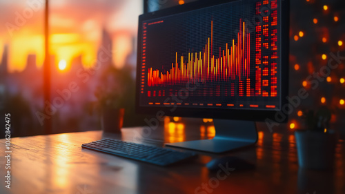 A computer monitor with a red line on it and a sunset in the background. Scene is tense and serious