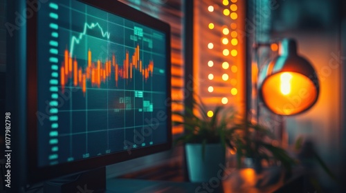 A computer screen displaying a stock market graph in a cozy, illuminated workspace.