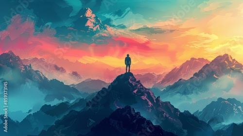 A conceptual illustration of a businessman standing on top of a mountain peak, looking out at a vast landscape, symbolizing success, vision, and achievement in business.