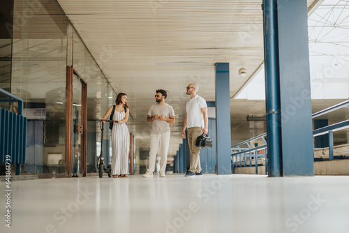A confident business group working outdoors, they strategize and target their audience, demonstrating successful teamwork and persistent leadership.