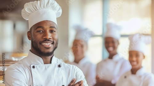 A confident chef in uniform smiles proudly in a bustling kitchen with colleagues, showcasing teamwork and culinary passion.